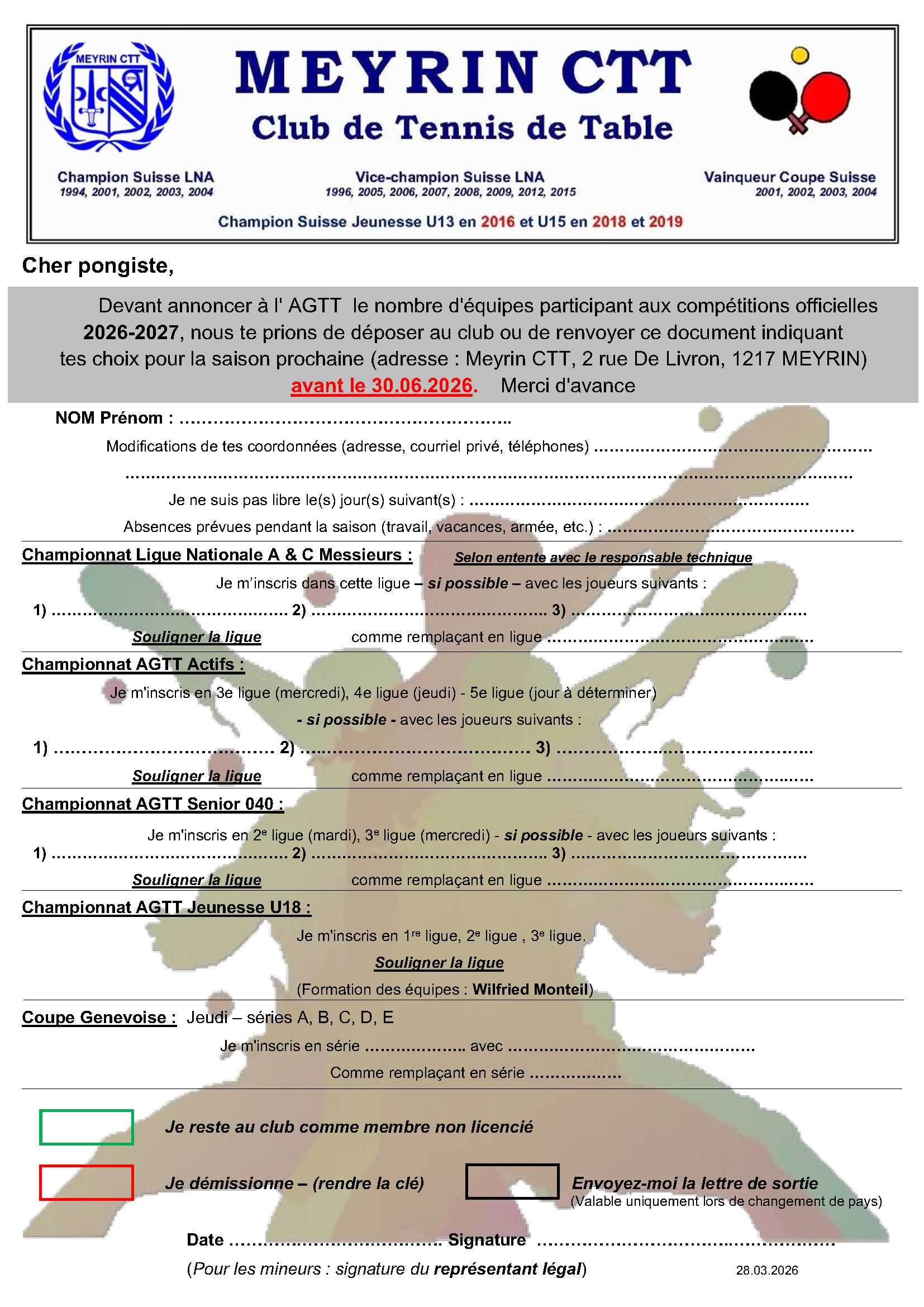 Chers(ères) membres, licenciés ou nouveau joueur(euse) qui désirez rejoindre une équipe pour la saison 2026 - 2027, veuillez remplir le document ci-dessous. Un nouveau joueur doit remplir les deux documents